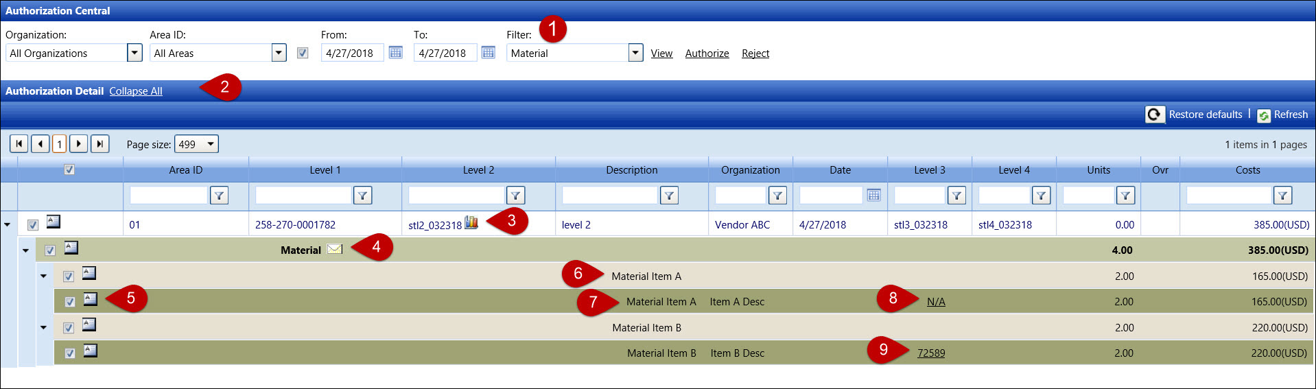 When the Material option is selected from the Filter drop-down list, the material items are displayed in the Authorization Detail grid.